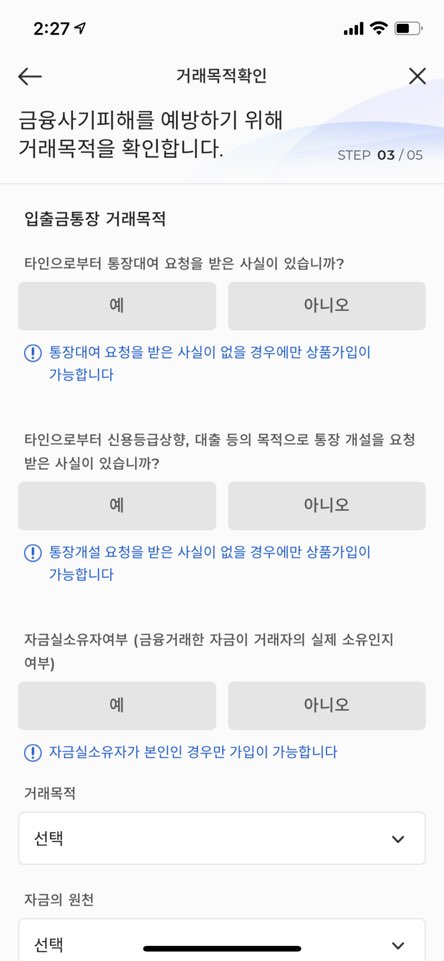금융사기피해를 예방하기 위해서 거래목적을 확인하는 단계인데요,