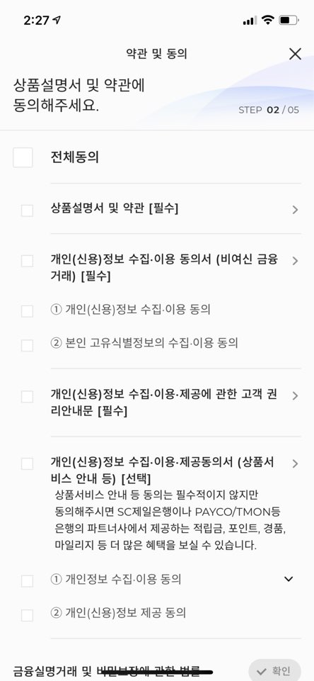 신분증 촬영이 완료되면 약관 및 동의 단계가 있습니다. 저의 경우 보통 '필수'들만 동의하고 '선택' 부분은 동의를 안해요 :-)