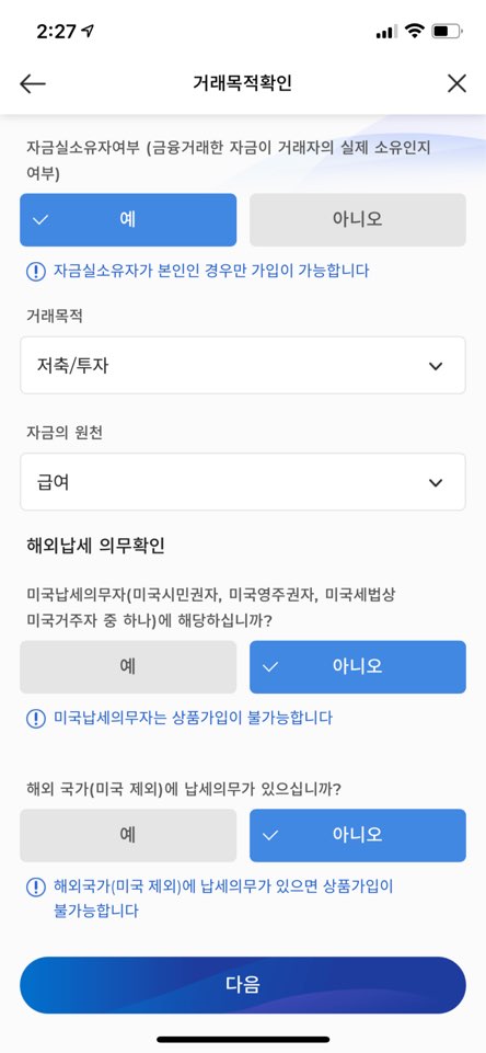 거래목적과 해외납세의무확인 등을 알맞게 체크해주시면 된답니다! 솔직하게 하시는게 좋겠죠? ㅎ--ㅎ