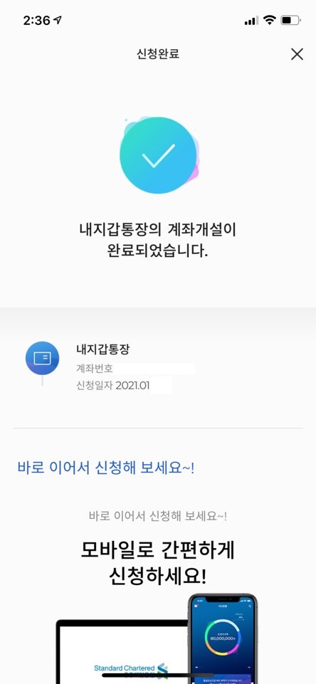 계좌비밀번호 4자리까지 설정하고 나면 '내지갑통장' 개설이 완료되었습니다! 복잡한듯 귀찮지만 그래도 영업점 가는 것보다는 나은 SC제일은행 모바일 어플을 이용한 비대면 입출금통장 개설 방법♥